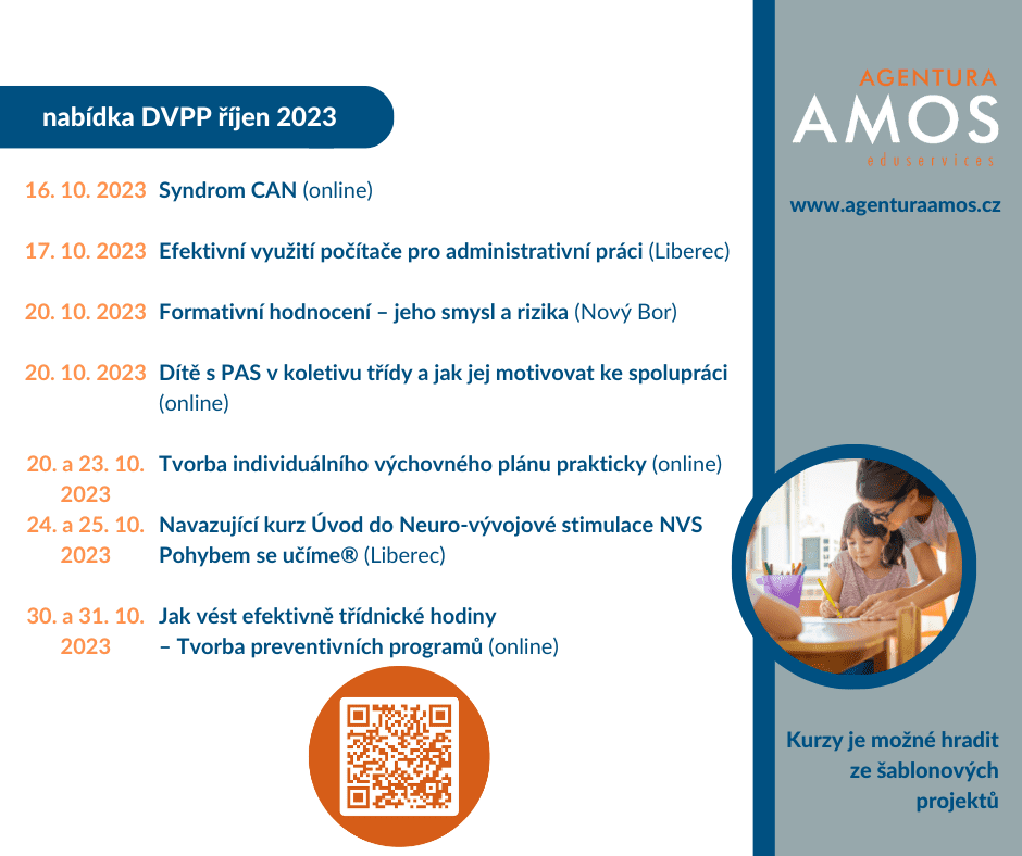 Na měsíc říjen jsme pro pedagogy i nepedagogické pracovníky mateřských, základních a středních škol připravili pestrou nabídku kurzů dalšího vzdělávání. Těšíme se na vaši účast.