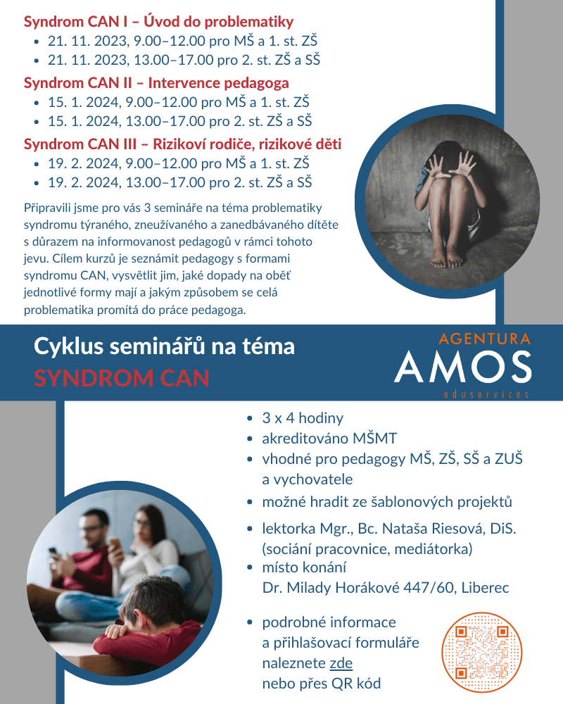 Syndrom CAN – připravili jsme pro vás 3 semináře na téma problematiky syndromu týraného, zneužívaného a zanedbávaného dítěte s důrazem na informovanost pedagogů v rámci tohoto jevu. Cílem kurzů je seznámit pedagogy s formami syndromu CAN, vysvětlit jim, jaké dopady na oběť jednotlivé formy mají a jakým způsobem se celá problematika promítá do práce pedagoga. Cyklus seminářů povede paní lektorka Mgr., Bc. Nataša Riesová.