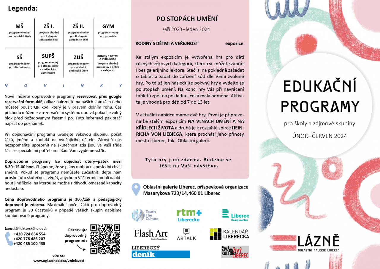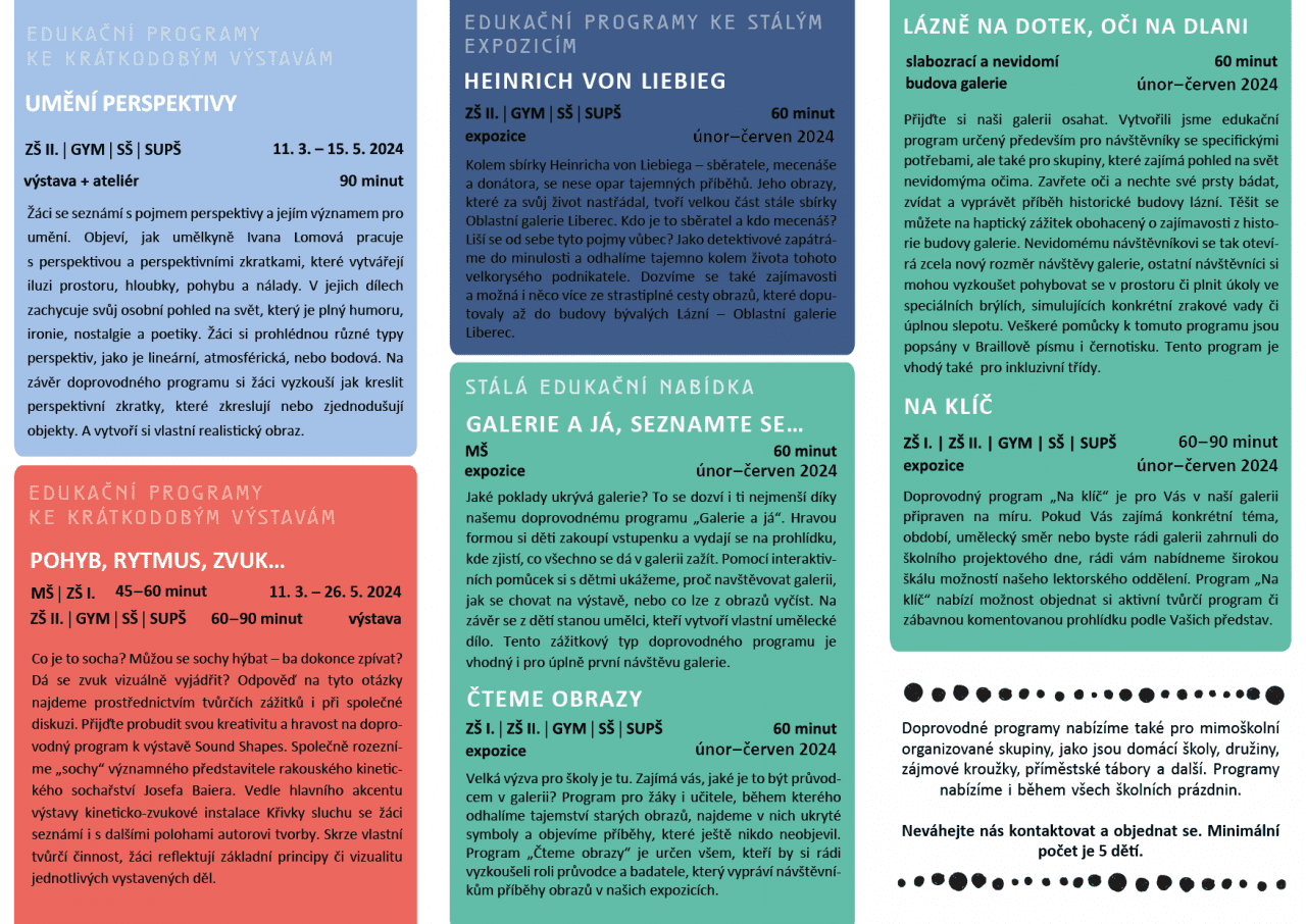 rádi bychom Vás informovali o nových edukačních programech v Oblastní galerii Liberec, které jsme pro Vás připravili na období únor–červen 2024. Celý přehled nabídky doprovodných programů najdete v .pdf souboru v příloze.