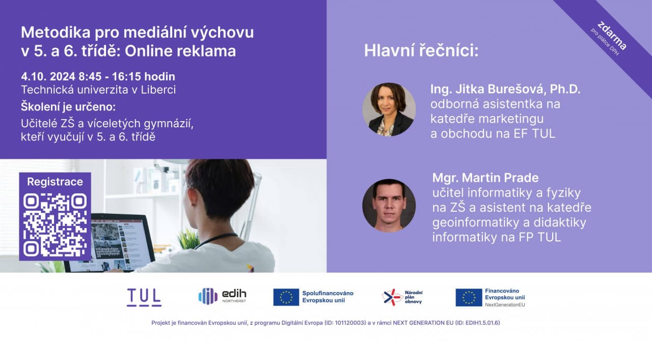 Další ze série školení v rámci projektu Evropský digitální inovační hub Northeast Bohemia (EDIH NEB) na Technické univerzitě v Liberci. Akce je určena pro učitele ZŠ a víceletých gymnázií, kteří vyučují v 5. a 6. třídě.
