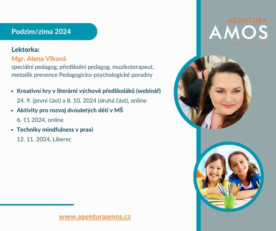 Neváhejte a přihlaste se na naše kurzy s oblíbenou lektorkou Alenou Vlkovou – speciální pedagožkou, terapeutkou a metodičkou prevence v pedagogicko-psychologické poradně.