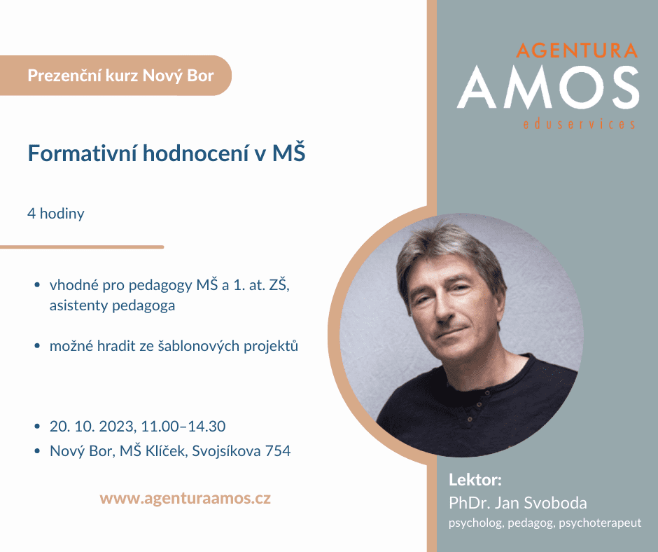 Ve spolupráci s pedagogem a psychologem PhDr. Janem Svobodou jsme pro pedagogy mateřských škol připravili kurz zaměřený na využívání formativního hodnocení v MŠ a na 1. stupni ZŠ. Seznamte se s vhodnými postupy implementace formativního hodnocení do výuky, zvyšte své kompetence k tvorbě hodnotících kritérií, která vedou ke správnému pochopení evaluačního procesu v současné mateřské a základní škole.