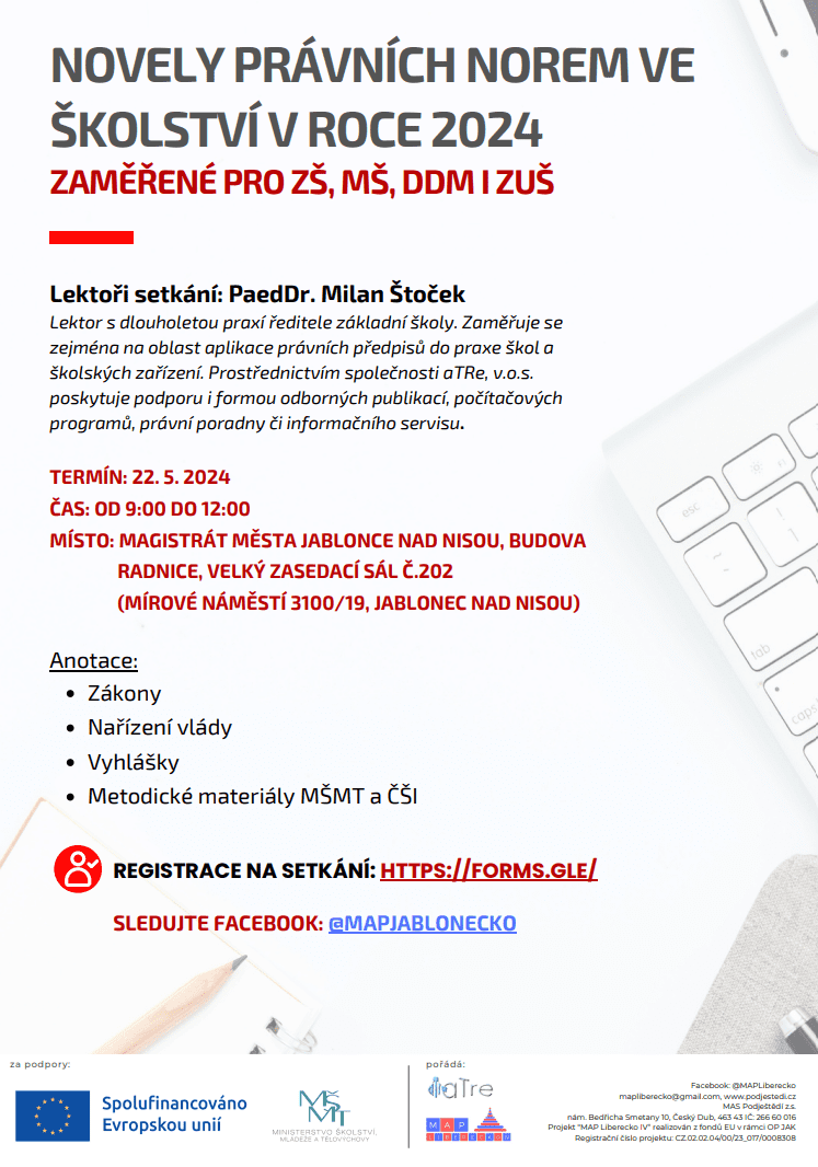 Novely právních norem ve školství v roce 2024, ZŠ, MŠ, ZUŠ, DDM (22. 5. 2024, MAP IV Jablonecko) ZDARMA