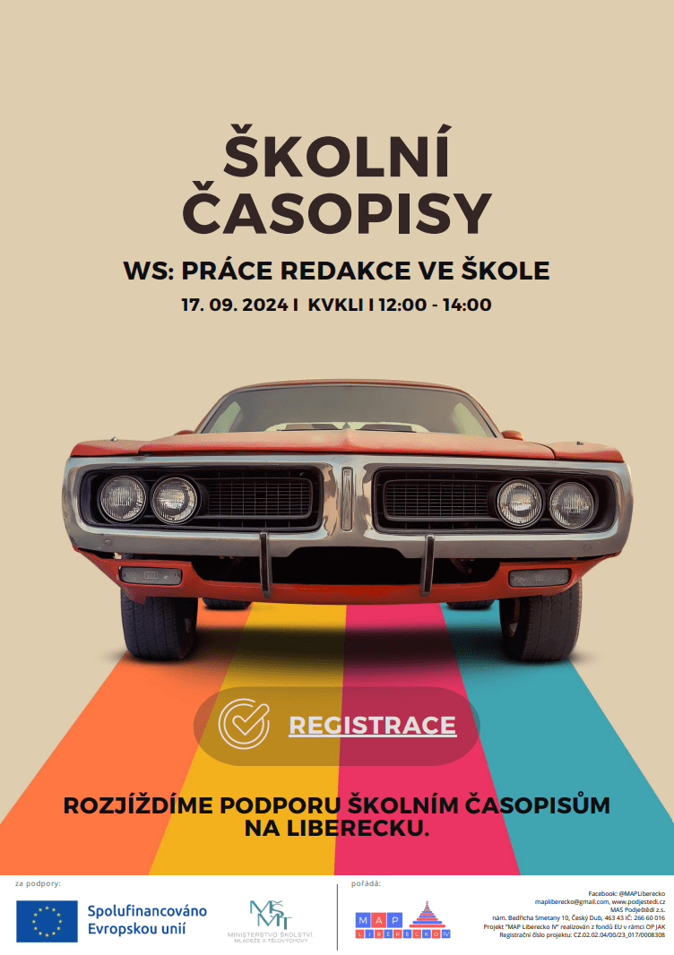 chystáme pro Vás a vaše žáky soutěž školních časopisů na Liberecku. Tvorba časopisů není jednoduchá. Víme jaká je to dřina, proto jsme pro vás připravily sérii workshopů a aktivit, které vám pomůžou s podporou i v případě, kdy jste školní časopis ještě nezaložily. Pozvání platí zejména pro žáky a zodpovědné pedagogy, případně pro zájemce o vytvoření časopisu na Vaší škole. Tento školní rok připravujeme 4 odborné setkání pro žáky s cílem rozvoje mediální gramotnosti, aby se zvýšila kvalita i množství školní časopisů na Liberecku.