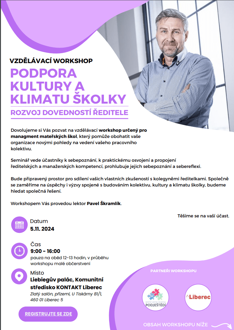 dovolujeme si vás pozvat na vzdělávací workshop pro ředitele a vedoucí pracovníky mateřských škol na téma: Podpora kultury a klimatu školy, rozvoj dovedností ředitele.