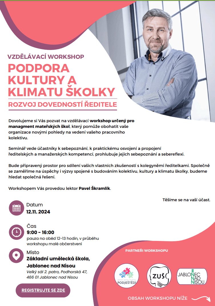 dovolujeme si vás pozvat na vzdělávací workshop pro ředitele a vedoucí pracovníky mateřských škol na téma: Podpora kultury a klimatu školy, rozvoj dovedností ředitele.