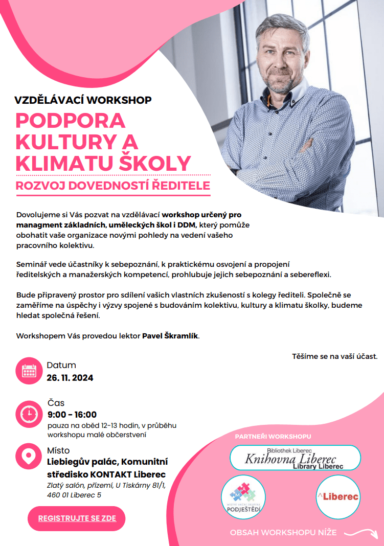 dovolujeme si vás pozvat na vzdělávací workshop pro ředitele a vedoucí pracovníky základních, základních uměleckých škol a DDM na téma: Podpora kultury a klimatu školy, rozvoj dovedností ředitele.