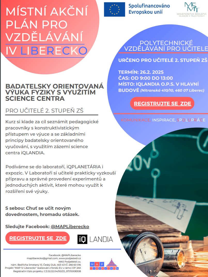 Vzdělávací kurz: Badatelsky orientovaná výuka fyziky s využitím science centra (pro učitelé 2. stupeň ZŠ) MAP IV Liberecko, ZDARMA
