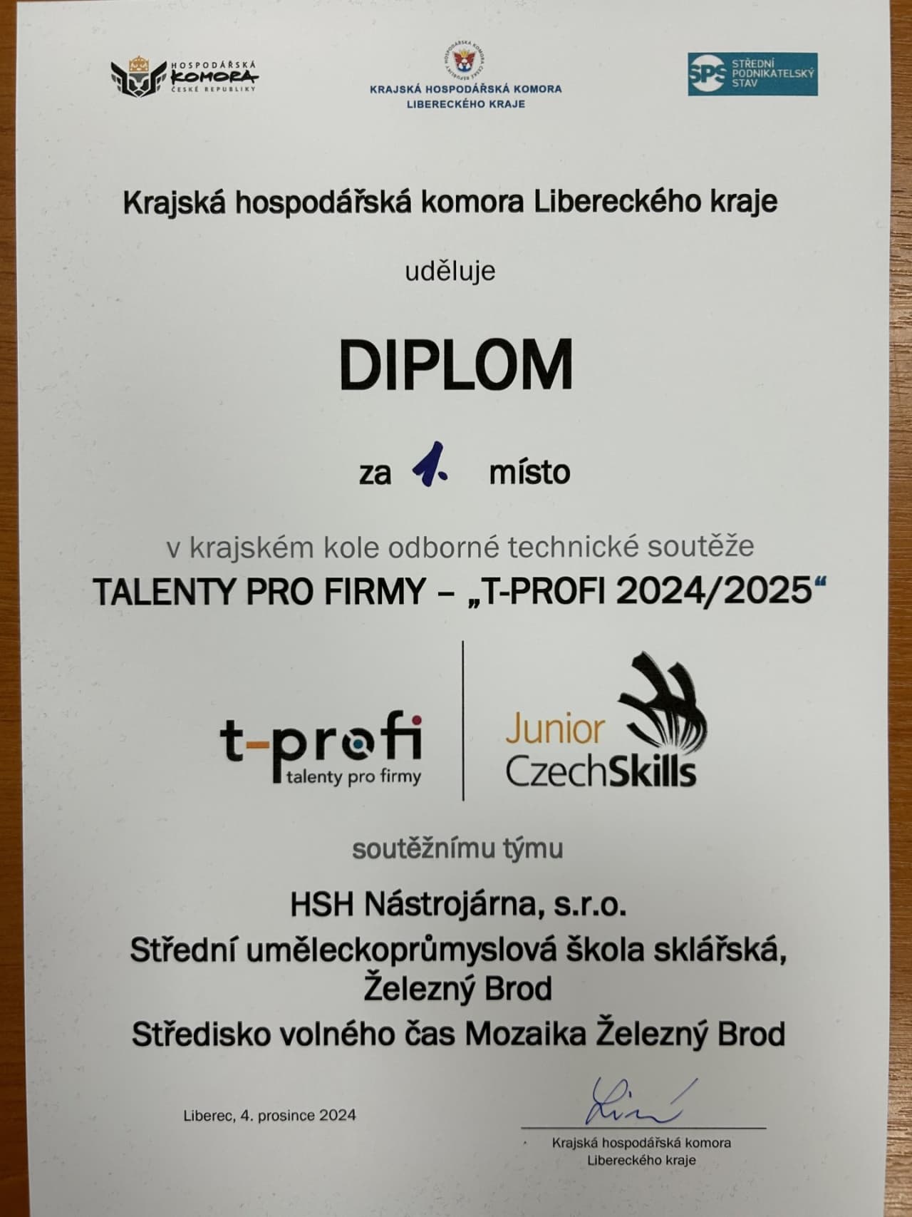 Smíšený tým Střední uměleckoprůmyslové školy sklářské a Střediska volného času Mozaika Železný Brod zvítězil v krajském kole 9. ročníku celostátní soutěže „Talenty pro firmy“ a postupuje do celostátního kola, které se bude konat v červnu 2025 v Praze.