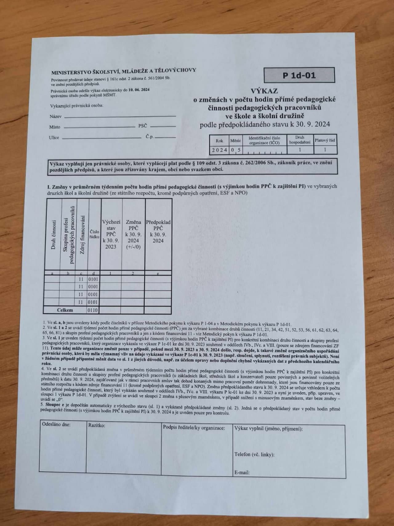 Ve výkazu P1d-01 se uvádí změna v průměrném týdenním počtu hodin přímé pedagogické činnosti realizované v rámci odpovídajícího RVP, které se budou realizovat podle předpokladu ke dni 30. 9. aktuálního kalendářního roku v porovnání s počtem vykázaným k 30. 9. předchozího kalendářního roku. Vykazuje se PPČ pedagogických pracovníků zaměstnaných jak na základě pracovních smluv, tak dohod konaných mimo pracovní poměr, a to za vybrané kombinace druhů činnosti a skupin profesí pedagogických pracovníků, kteří budou financování ze státního rozpočtu kromě podpůrných opatření, ESF a Národního plánu obnovy (kód zdroje financování – 11).