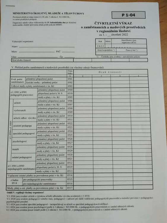 Byl zahájen sběr výkazů P 1-04 o zaměstnancích a mzdových prostředcích za období leden - březen/2022. Školy/školská zařízení by měly odeslat tyto výkazy příslušnému správnímu úřadu nejpozději do