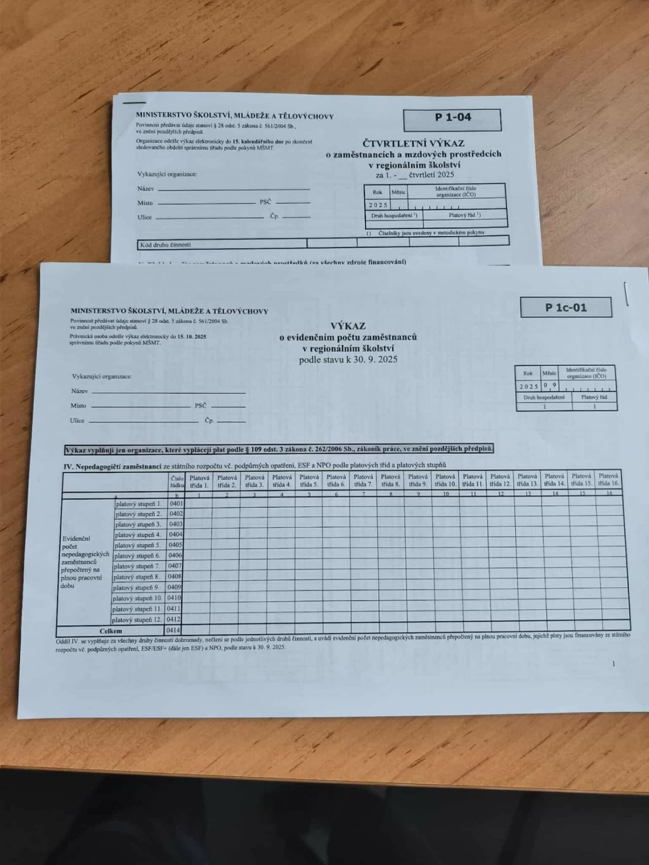 - Od 1. 9. 2025 je platná novela zákona 563/2004 o pedagogických pracovnicích a přináší změnu pro vymezení pozice sociálního pedagoga, který nově může mít tzv. přímou sociálně pedagogickou činnost (dále jen PPČ). PPČ stanovuje ředitel školy. Pokud bude PPČ sociálnímu pedagogovi stanovena, bude se vykazovat v ostatních pedagogických pracovnicích (do řádku 0520, 0521, 0353, 0354). Vykazování je možné pouze od 1. 9. 2025, týká se jen jednoho měsíce 3. kvartálu roku 2025 (respektive jednoho měsíce celého vykazovaného období kumulativního výkazu P1-04). NEDOJDE tedy k přesunu dosavadních vykazovaných úvazků, které se do 31. 8. 2025 uváděly jako nepedagogická pozice v ostatních nepedagozích, a to z důvodu, že výkaz je nápočtový! V případě, že ředitel školy nestanoví PPČ, bude nadále sociální pedagog vykazován jako nepedagogická pozice.