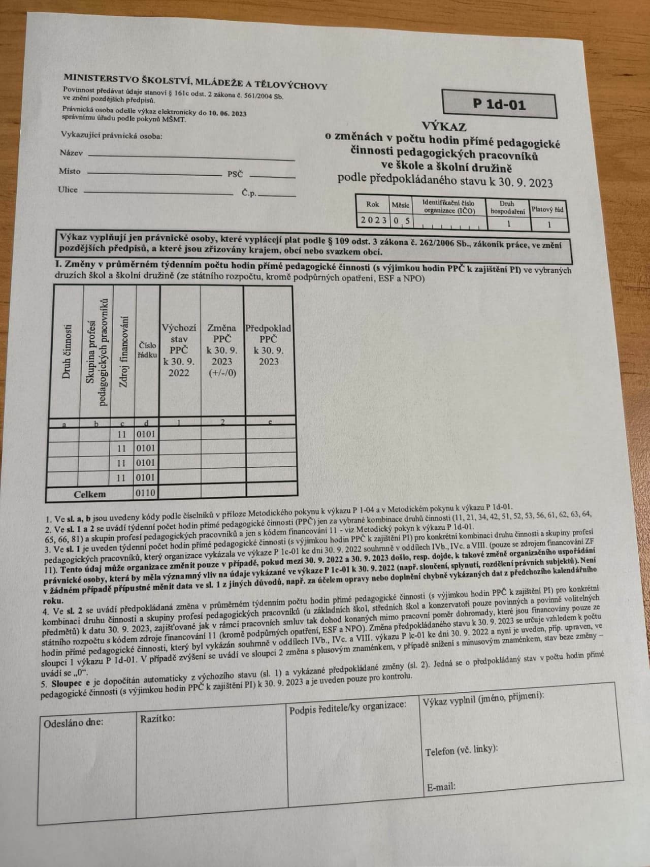 Výkaz P1d-01 vyplňují v souladu s vyhláškou č. 161/2018 Sb. jen právnické osoby, které vyplácejí plat podle § 109 odst. 3 zákona č. 262/2006 Sb., zákoníku práce, ve znění pozdějších předpisů, a které vykonávají činnost mateřské školy, základní školy, střední školy, konzervatoře nebo školní družiny zřizované krajem, obcí nebo dobrovolným svazkem obcí a zapsané v rejstříku škol a školských zařízení. Organizace odesílá výkaz P1d-01 v období od 31. května do 10. června 2023.
